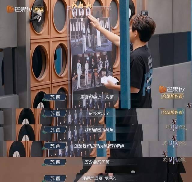在节目中,苏醒表示:距离我们上次第一,已经太远了,虽然我们很快乐,但也可以拿到很好的成绩,五公拿不到第一,我原地退赛,我说的,不得不说,苏醒立的flag真的太大了,虽然给人一种信心十足的感觉,可这绝对是玩笑话。